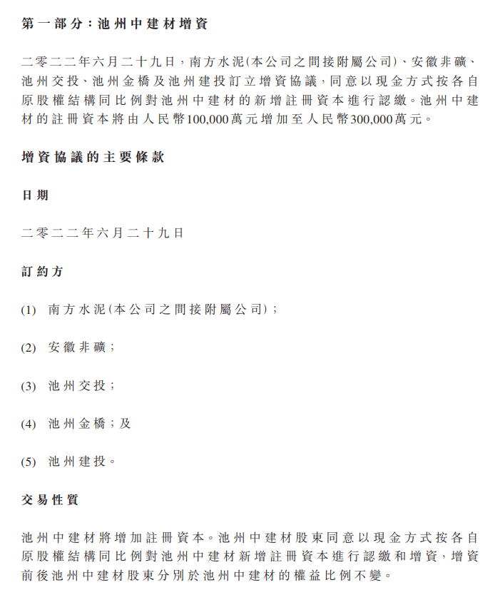中國建材(03323)公布,于2022年6月29日,南方水泥(該公司的間接附屬公司)、安徽非礦、池州交投、池州金橋及池州建投訂立增資協議,同意以現金方式按各自原股權結構同比例對池州中建材的新增注冊資本進行認繳。池州中建材的注冊資本將由人民幣10億元增加至人民幣30億元,其中南方水泥認繳新增注冊資本人民幣12億元,安徽非礦、池州交投、池州金橋及池州建投各認繳人民幣2億元。
