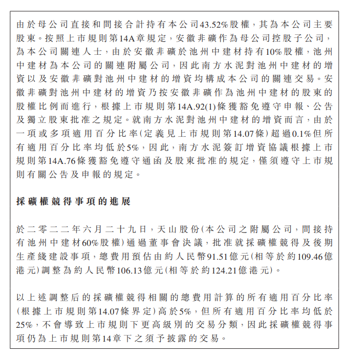 同日,天山股份(該公司的附屬公司,間接持有池州中建材60%股權)通過董事會決議,批準就采礦權競得及后期生產線建設事項,總費用預估由約人民幣91.51億元(相等于約109.46億港元)調整為約人民幣106.13億元(相等于約124.21億港元)。