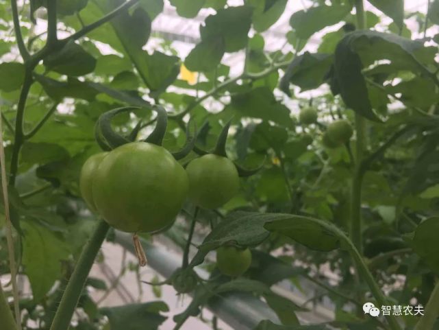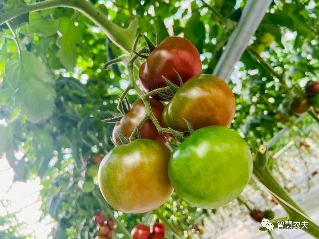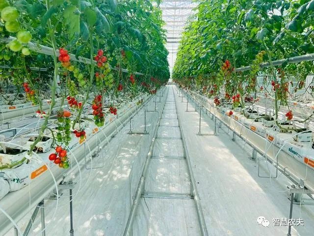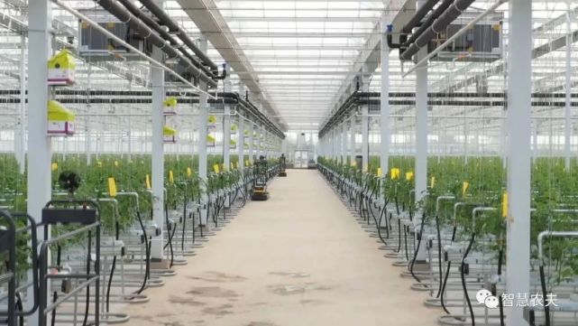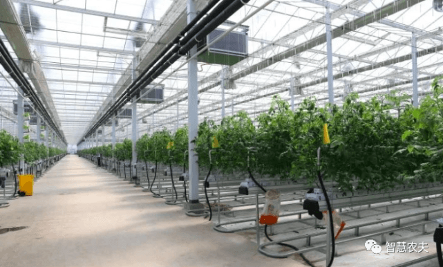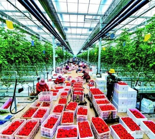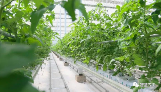 在溫室內碧綠的番茄長得郁郁蔥蔥,長長的懸掛式鋼絲蔓繩,有利于作物攀爬生長,增加產量。成排的管道通往室內各個方向,筆直的采摘軌道,既用來運載采摘車,也用來傳遞余熱轉化成的熱水或者冷水。番茄生長每一個環節都依托大數據云計算自動采集、監測、分析農作物生長環境信息,并利用物聯網技術,精準調控棚內的溫度、濕度、施肥量、澆水量等,科學調節農作物生命規律,延長生長周期,實現智慧化管理、標準化生產。