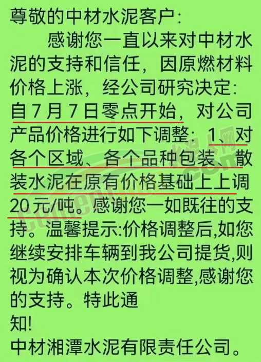 中材湘潭水泥有限責(zé)任公司通知,因原燃材料價格上漲,經(jīng)公司研究決定自7月7日零點開始,對各區(qū)域、各品牌包裝、散裝水泥在原價基礎(chǔ)上上調(diào)20元/噸。