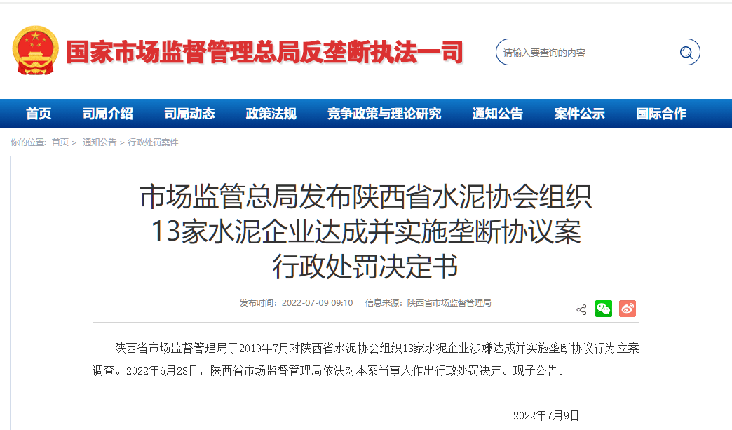 日前,國(guó)家市場(chǎng)監(jiān)管總局發(fā)布陜西省水泥協(xié)會(huì)組織13家水泥企業(yè)達(dá)成并實(shí)施壟斷協(xié)議案行政處罰決定書稱,陜西省市場(chǎng)監(jiān)督管理局于2019年7月對(duì)陜西省水泥協(xié)會(huì)組織13家水泥企業(yè)涉嫌達(dá)成并實(shí)施壟斷協(xié)議行為立案調(diào)查。2022年6月28日,陜西省市場(chǎng)監(jiān)督管理局依法對(duì)本案當(dāng)事人作出行政處罰決定。現(xiàn)予公告。