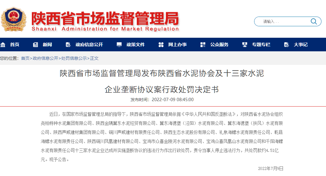 陜西省市場(chǎng)監(jiān)督管理局發(fā)布《陜西省水泥協(xié)會(huì)及十三家水泥企業(yè)壟斷協(xié)議案行政處罰決定書》稱,近日,在國(guó)家市場(chǎng)監(jiān)督管理總局的指導(dǎo)下,陜西省市場(chǎng)監(jiān)督管理局依據(jù)《中華人民共和國(guó)反壟斷法》,對(duì)十三家水泥企業(yè)達(dá)成并實(shí)施壟斷協(xié)議的違法行為作出行政處罰,責(zé)令當(dāng)事人停止違法行為,共處罰款約4.51億元。