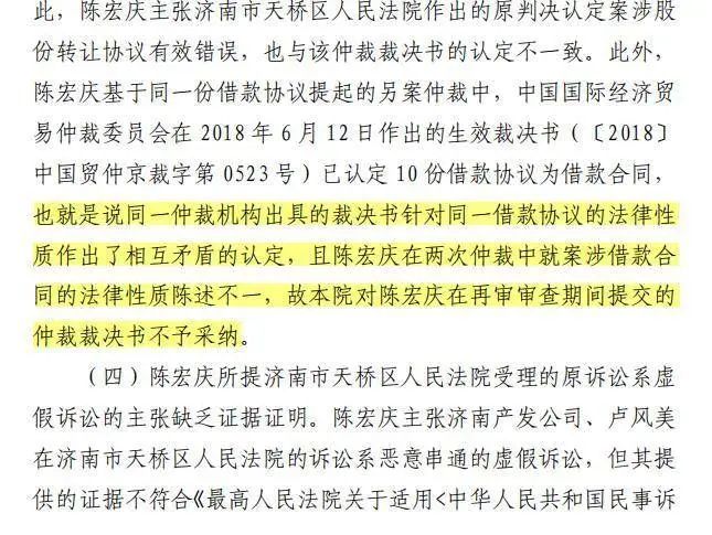 記者獲取的裁定書顯示,對于貿仲會在2018年6月12日、2022年2月22日所做的兩份裁決,山東省高院認為:“同一仲裁機構出具的裁決書針對同一借款協議的法律性質作出了相互矛盾的認定,且陳宏慶在兩次仲裁中就案涉借款合同的法律性質陳述不一,故本院對陳宏慶在再審審查期間提交的仲裁裁決書不予采納。”