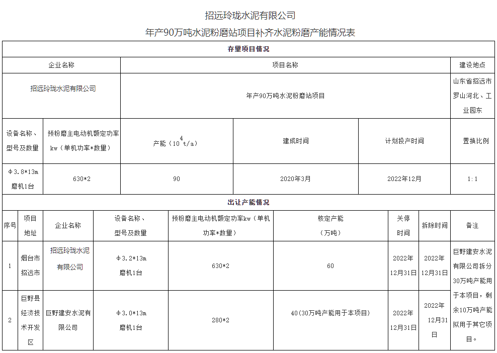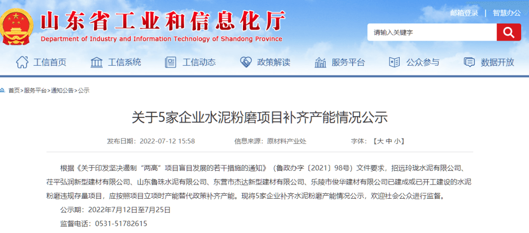 日前,山東工信廳發布《關于5家企業水泥粉磨項目補齊產能情況公示》稱,根據《關于印發堅決遏制“兩高”項目盲目發展的若干措施的通知》(魯政辦字〔2021〕98號)文件要求,招遠玲瓏水泥有限公司、茌平弘潤新型建材有限公司、山東魯珠水泥有限公司、東營市杰達新型建材有限公司、樂陵市俊華建材有限公司已建成或已開工建設的水泥粉磨違規存量項目,應按照項目立項時產能替代政策補齊產能。