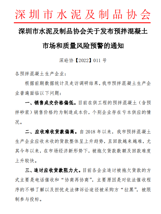 日前,深圳市水泥及制品協會關于發布預拌混凝土市場和質量風險預警的通知給各預拌混凝土生產企業稱,根據前期數據統計及走訪調研結果,深圳市預拌混凝土生產企業普遍面臨銷售成交價格偏低、應收難收貨款偏高、追討應收貨款阻力大、新中標價格持續偏低等問題。