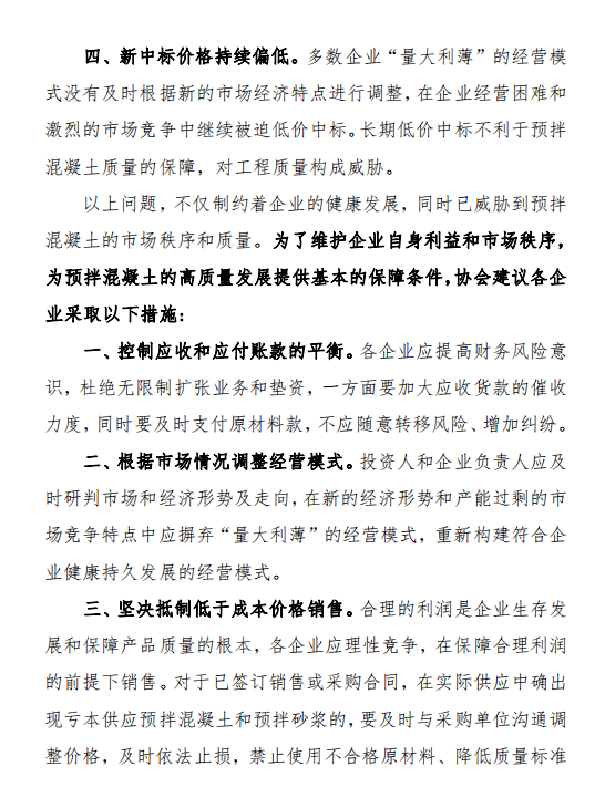 以上問題,不僅制約著企業的健康發展,同時已威脅到預拌混凝土的市場秩序和質量。為了維護企業自身利益和市場秩序,為預拌混凝土的高質量發展提供基本的保障條件,協會建議各企業,控制應收和應付賬款的平衡、根據市場情況調整經營模式、堅決抵制低于成本價格銷售、遵守法律法規依法催收貨款。