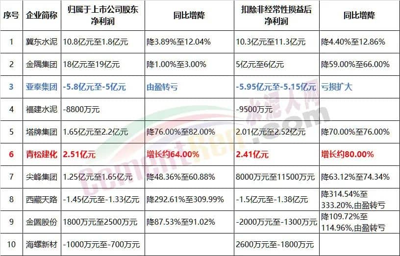 日前,冀東水泥、金隅集團(tuán)、亞泰集團(tuán)、福建水泥、塔牌水泥、青松建化、尖峰集團(tuán)、西藏天路、金圓股份以及海螺新材等10家企業(yè)發(fā)布上半年業(yè)績預(yù)告。除青松建化業(yè)績預(yù)增外,亞泰集團(tuán)業(yè)績預(yù)虧,其他8家企業(yè)預(yù)告業(yè)績下滑。