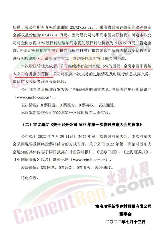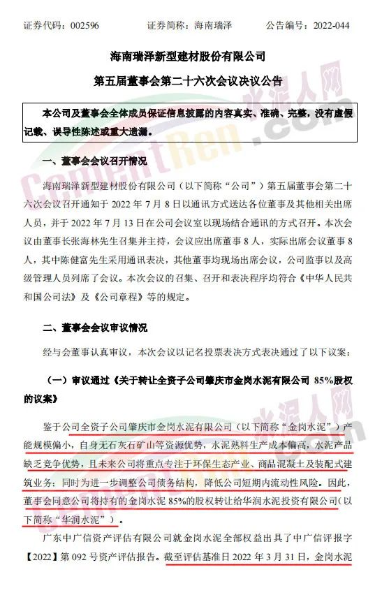 7月13日,海南瑞澤發(fā)布公告,鑒于公司全資子公司肇慶市金崗水泥有限公司(以下簡稱“金崗水泥”)產(chǎn)能規(guī)模偏小,自身無石灰石礦山等資源優(yōu)勢,水泥熟料生產(chǎn)成本偏高,水泥產(chǎn)品缺乏競爭優(yōu)勢,且未來公司將重點(diǎn)專注于環(huán)保生態(tài)產(chǎn)業(yè)、商品混凝土及裝配式建筑業(yè)務(wù);同時為進(jìn)一步調(diào)整公司債務(wù)結(jié)構(gòu),降低公司短期內(nèi)流動性風(fēng)險。因此,董事會同意公司將持有的金崗水泥85%的股權(quán)轉(zhuǎn)讓給華潤水泥投資有限公司。