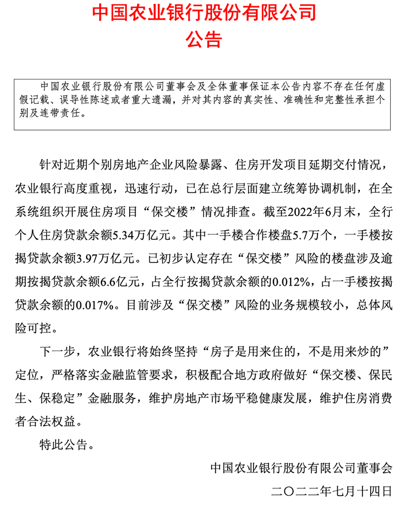 公告稱,截至2022年6月末,農業銀行全行個人住房貸款余額5.34萬億元。其中一手樓合作樓盤5.7萬個,一手樓按揭貸款余額3.97萬億元。已初步認定存在“保交樓”風險的樓盤涉及逾期按揭貸款余額6.6億元,占全行按揭貸款余額的0.012%,占一手樓按揭貸款余額的0.017%。目前涉及“保交樓”風險的業務規模較小,總體風險可控。