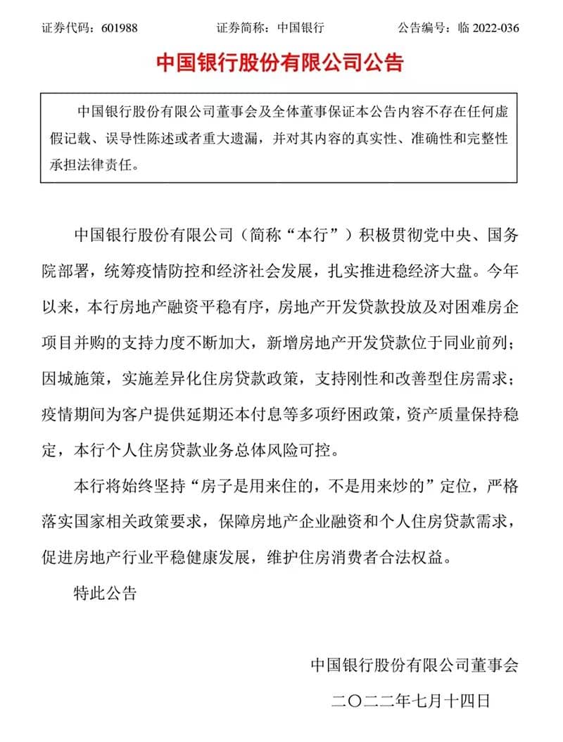 中國銀行公告稱,今年以來,該行房地產融資平穩有序,房地產開發貸款投放及對困難房企項目并購的支持力度不斷加大,新增房地產開發貸款位于同業前列;因城施策,實施差異化住房貸款政策,支持剛性和改善型住房需求;疫情期間為客戶提供延期還本付息等多項紓困政策,資產質量保持穩定,該行個人住房貸款業務總體風險可控。