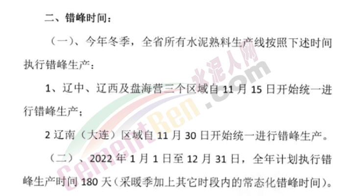 據(jù)水泥人網(wǎng)此前報(bào)道,早在去年12月遼寧省建筑材料工業(yè)協(xié)會水泥分會就發(fā)布了《遼寧省水泥行業(yè)2021年冬季和2022年錯(cuò)峰生產(chǎn)方案》要求:2022年1月1日至12月31日,全年計(jì)劃執(zhí)行錯(cuò)峰生產(chǎn)時(shí)間180天。