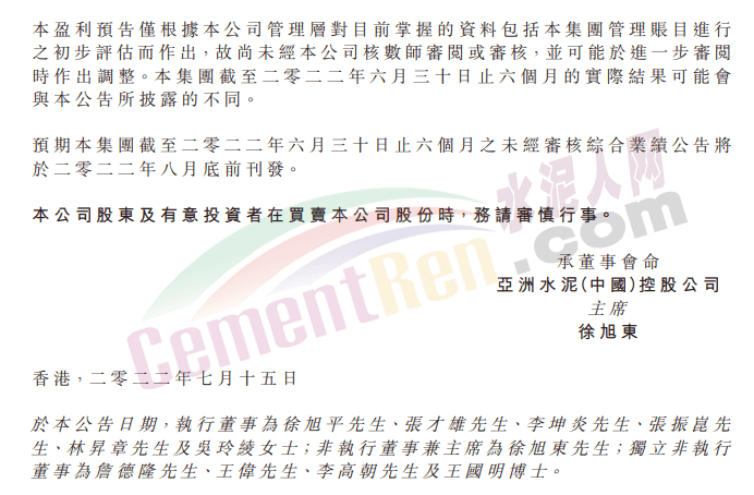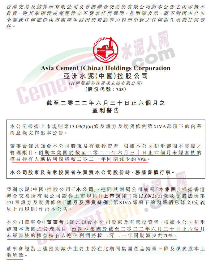 亞洲水泥預計上半年利潤同比減少約70%!