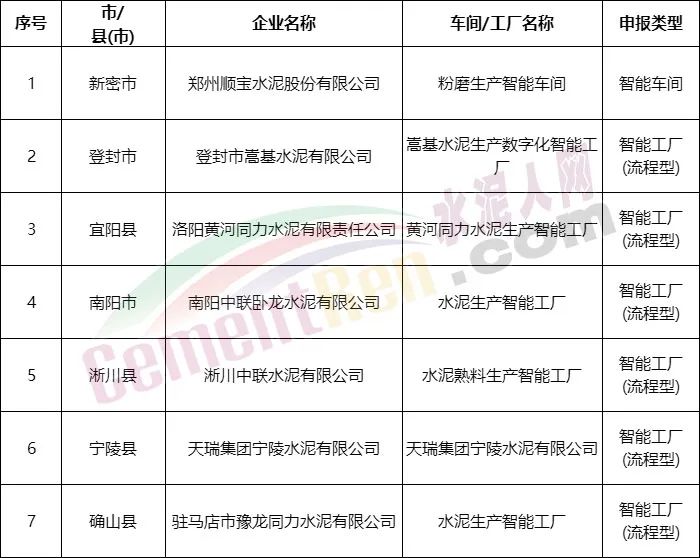 7月12日,河南省工信廳發布《2022年河南省智能車間智能工廠擬確定名單》公示,名單中包括洛陽黃河同力水泥有限責任公司、南陽中聯臥龍水泥有限公司、淅川中聯水泥有限公司、天瑞集團寧陵水泥有限公司、駐馬店市豫龍同力水泥有限公司、鄭州順寶水泥股份有限公司、登封市嵩基水泥有限公司等七家水泥企業。