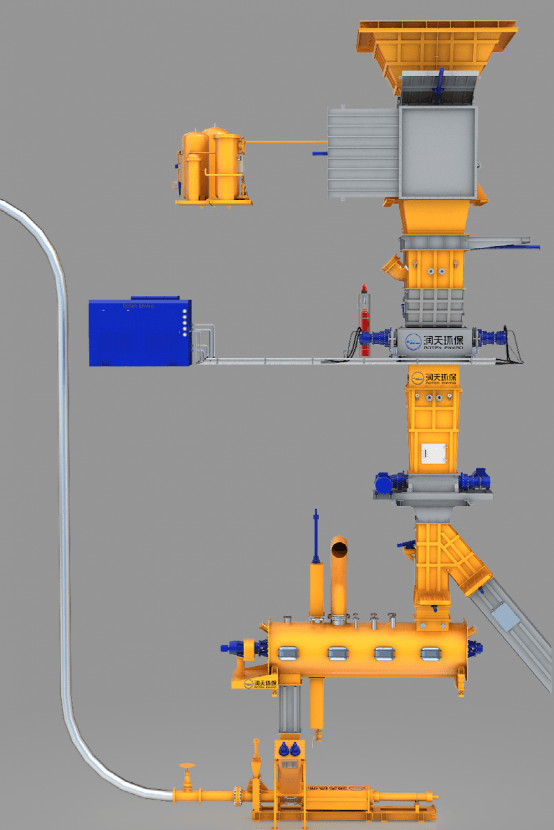 ④半固態廢物,從預燃爐尾部管道通過柱塞泵全自動、全密閉、定量給料進入爐內;
