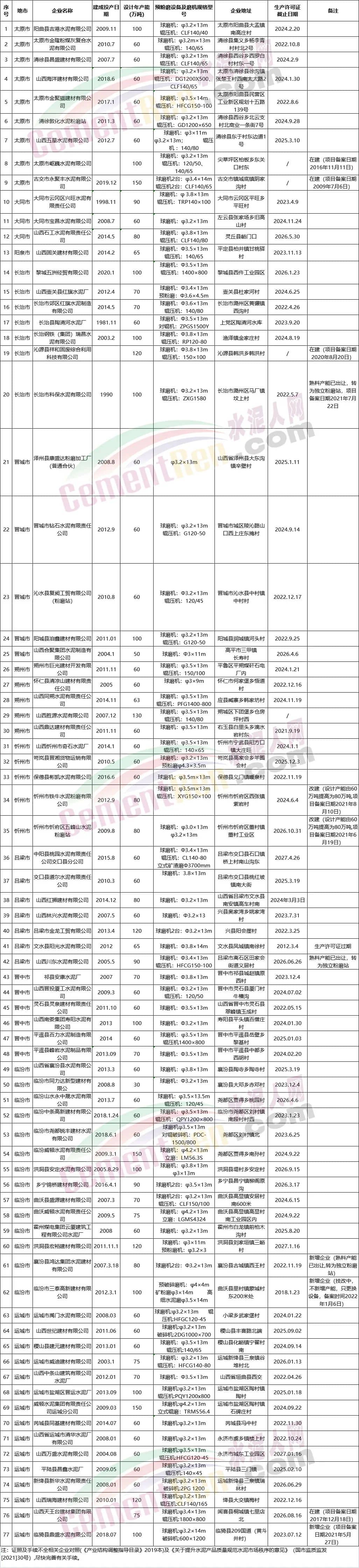 山西省水泥熟料生產(chǎn)線清單(截止2021年12月)