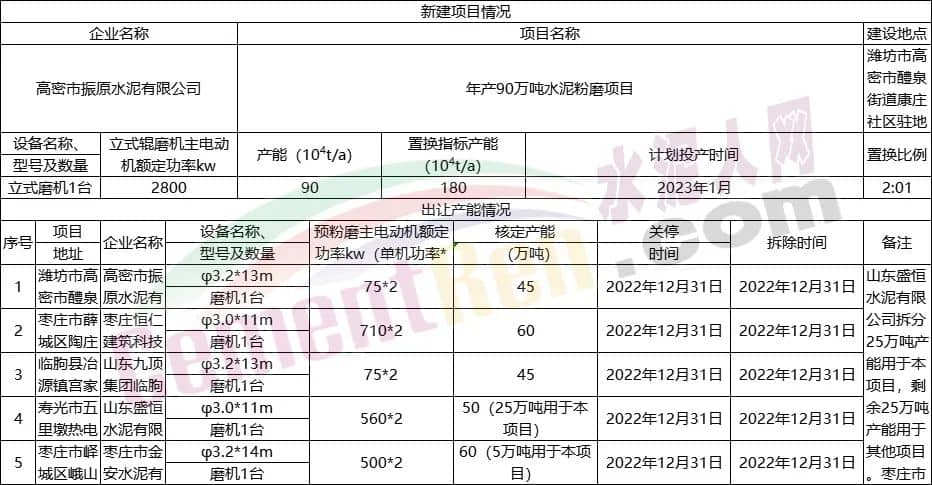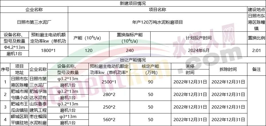 日前,山東省工信廳發布《關于8家企業新建水泥粉磨項目產能置換情況公示》稱,根據相關文件規定,8家企業制定了產能置換方案。置換比例全部為2:1,新建線產能規模為90~120萬噸/年,擬投產日期從2022年12月至2024年6月,合計產能達810萬噸/年,詳情如下: