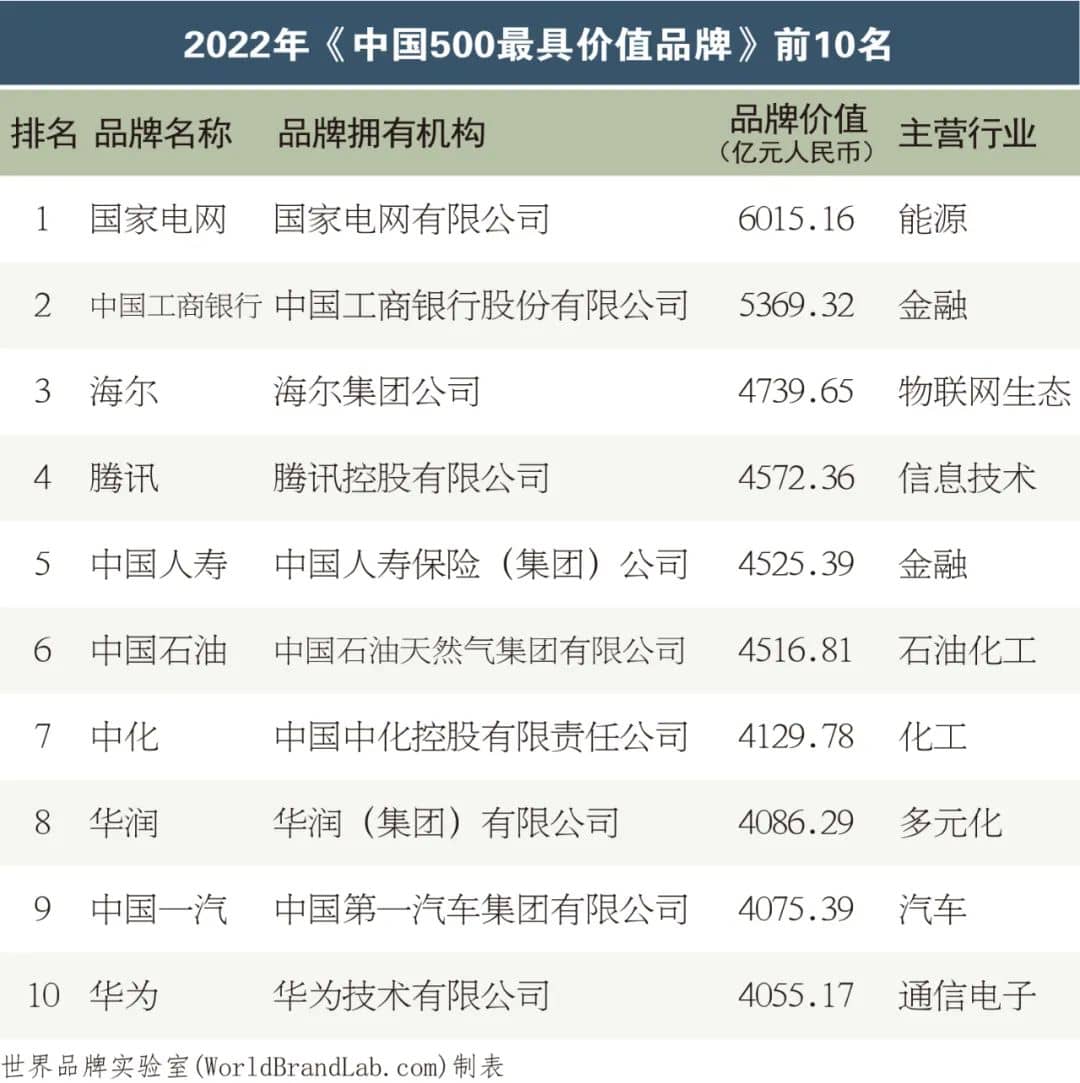由世界品牌實驗室(World Brand Lab)主辦的(第十九屆)“世界品牌大會”于7月26日在北京舉行,會上發布了2022年《中國500最具價值品牌》分析報告。在這份基于財務數據、品牌強度和消費者行為分析的年度報告中,國家電網以6015.16億元的品牌價值榮登本年度最具價值品牌榜首。占據榜單前五名的還有中國工商銀行(5369.32億元)、海爾(4739.65億元)、騰訊(4572.36億元)、中國人壽(4525.39億元),這些品牌已經邁進世界級品牌陣營。來自哈佛、耶魯、牛津、歐洲工商管理學院、倫敦大學學院的管理大師們出席了“世界品牌大會”并做在線演講,圍繞“氣與勢:如何重建品牌生態系統”的大會主題與現場嘉賓互動研討。