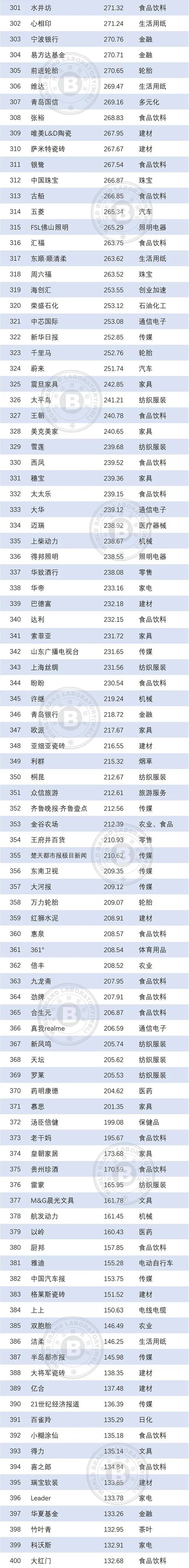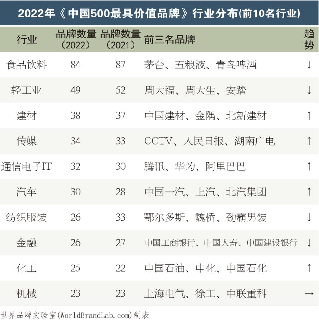 盡管新冠疫情沒有阻擋中國品牌價值整體上升的趨勢,但是與去年相比,航空、旅游服務、紡織服裝、地產、零售等受疫情影響大的行業入榜品牌數量均出現下降,而汽車、通信電子IT、農業等行業入榜品牌均有不同程度增加。本年度《中國500最具價值品牌》排行榜中,共有來自食品飲料、輕工業、建材、傳媒、紡織服裝、醫藥、機械等在內的25個相關行業的品牌入選。其中食品飲料業依然是入選品牌最多的行業,共有84個品牌入選,占總入選品牌數的16.80%;入選數量位居第二到第五的行業分別是輕工(49個)、建材(38個)、傳媒(34個)、通信電子IT(32個)。本年度共有69個中國品牌的價值超過1000億,比去年增加了12個。