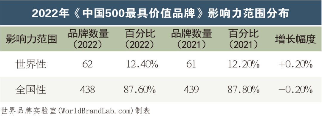 2022年《中國500最具價值品牌》的總價值為309728.07億元,比去年增加30774.87億元,增加幅度為11.03%。世界品牌實驗室學術委員會主席、牛津大學(Oxford)營銷學榮譽教授斯蒂芬·沃格(Steve Woolgar)表示:“品牌是一個國家的形象,我希望世界上更多的人能夠通過中國品牌了解中國的故事。在過去的17年中,我目睹了中國品牌的快速成長,有的已經具有強大的世界影響力”。世界品牌實驗室編制中國品牌報告已是第19個年頭,2004年入選門檻僅為5億元,前500名品牌的平均價值為49.43億元。19年以后的2022年,入選門檻已經提高到31.67億元,而前500名品牌的平均價值高達619.46億元,增加幅度為1153.21%。