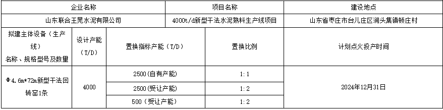 日前,山東工信廳發(fā)布公告稱,按照相關(guān)文件要求,對(duì)山東聯(lián)合王晁水泥有限公司4000t/d新型干法水泥熟料產(chǎn)線產(chǎn)能情況進(jìn)行公告。項(xiàng)目通過(guò)拆除山東聯(lián)合王晁水泥有限公司自有2500t/d以及龍口市泛林水泥有限公司2500t/d和泰安魯潤(rùn)水泥有限公司1000t/d熟料生產(chǎn)線新建一條4000t/d熟料生產(chǎn)線,建設(shè)地址位于山東省棗莊市臺(tái)兒莊區(qū)澗頭集鎮(zhèn)頓莊村。擬建主體將采用Φ4.6m*72m新型干法回轉(zhuǎn)窯1條。計(jì)劃點(diǎn)火投產(chǎn)時(shí)間為2024年12月31日。