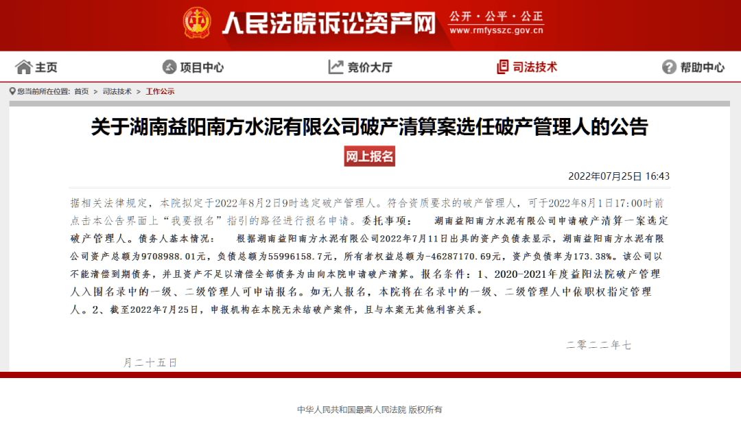 日前,人民法院訴訟資產(chǎn)網(wǎng)發(fā)布《關于湖南益陽南方水泥有限公司破產(chǎn)清算案選任破產(chǎn)管理人的公告》稱,據(jù)相關法律規(guī)定,法院擬定于2022年8月2日9時選定破產(chǎn)管理人。符合資質(zhì)要求的破產(chǎn)管理人,可于2022年8月1日17:00時前點擊本公告界面上“我要報名”指引的路徑進行報名申請。