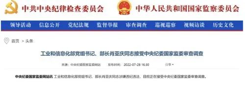 7月28日16時30分,據中央紀委國家監委官網消息,工業和信息化部黨組書記、部長肖亞慶同志涉嫌違紀違法,目前正在接受中央紀委國家監委審查調查。