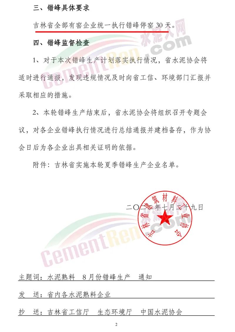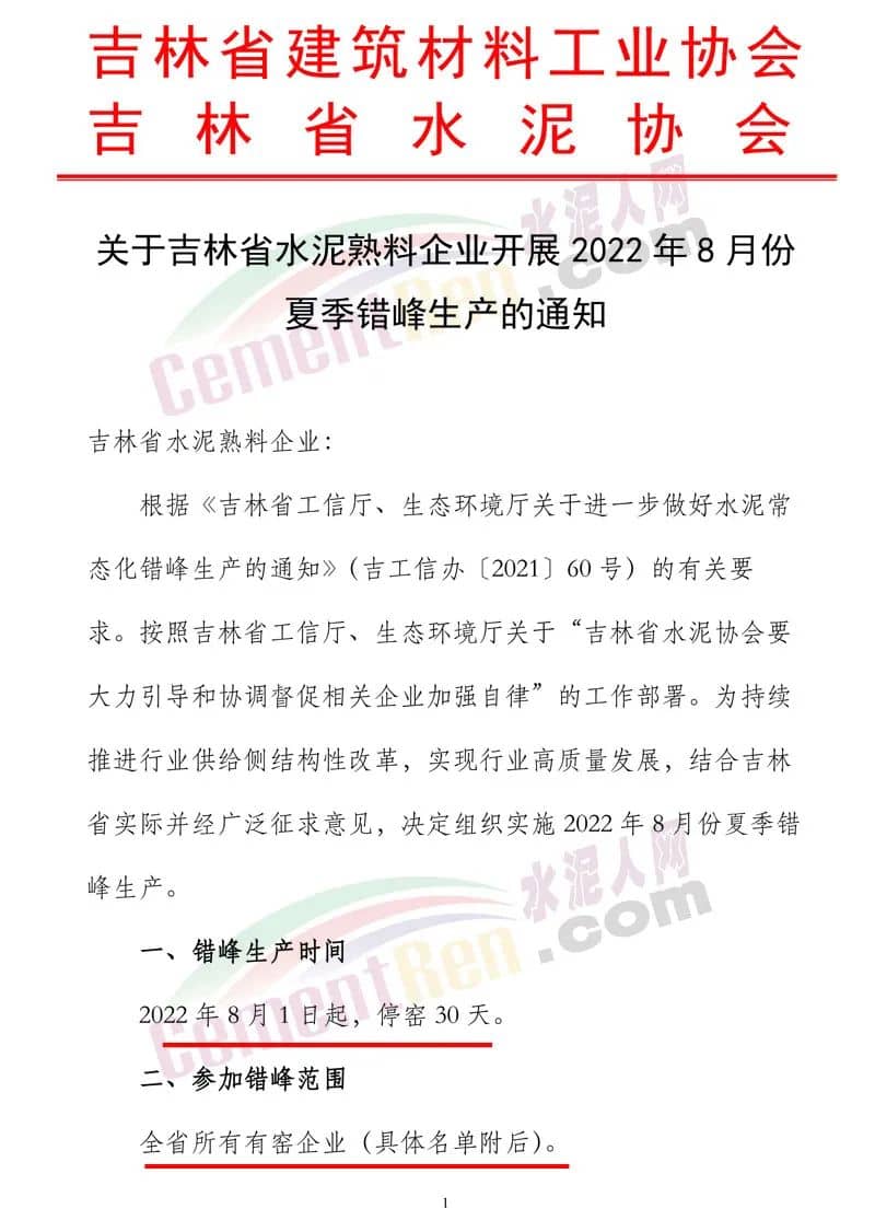 吉林省建筑材料工業(yè)協(xié)會吉林省水泥協(xié)會發(fā)布《關(guān)于吉林省水泥熟料企業(yè)開展2022年8月份夏季錯峰生產(chǎn)的通知)給吉林省水泥熟料企業(yè)要求實施2022年8月份夏季錯峰生產(chǎn)。
