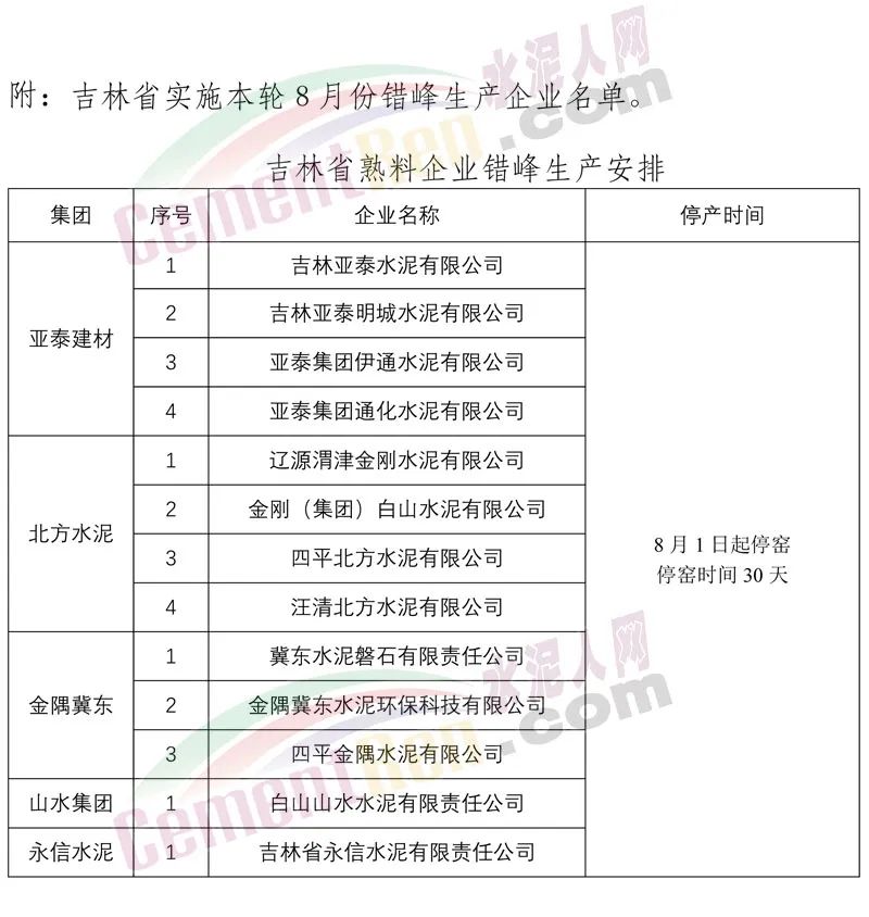 吉林省實施8月份錯峰生產(chǎn)企業(yè)名單中包括亞泰建材、北方水泥、金隅冀東、山水集團(tuán)、永信水泥等5家企業(yè)。