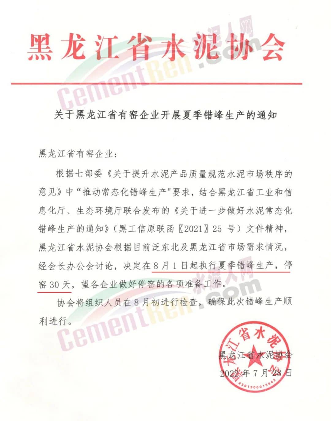 黑龍江省水泥協(xié)會發(fā)布《關(guān)于黑龍江省有窯企業(yè)開展夏季錯峰生產(chǎn)的通知》給黑龍江省有窯企業(yè)要求自在8月1日起執(zhí)行夏季錯峰生產(chǎn),停窯30天。