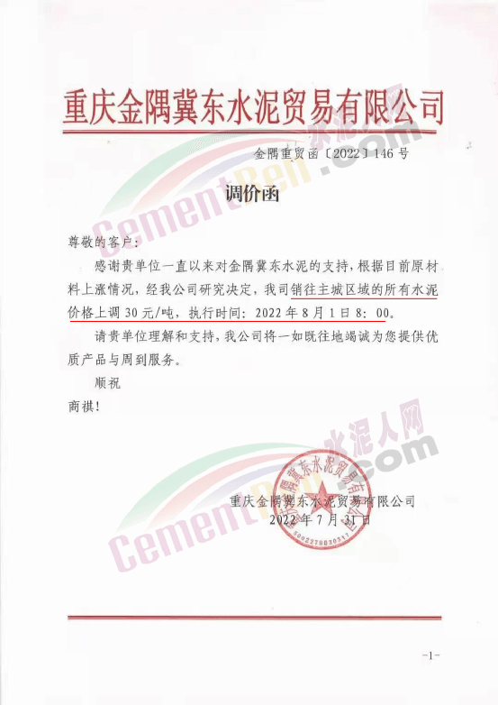 重慶金隅冀東水泥貿(mào)易有限公司通知,根據(jù)目前原材料上漲情況,經(jīng)公司研究決定,自8月1日8時起,銷往重慶主城區(qū)的所有水泥價格上調(diào)30元/噸。