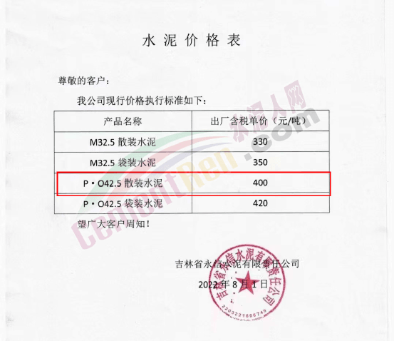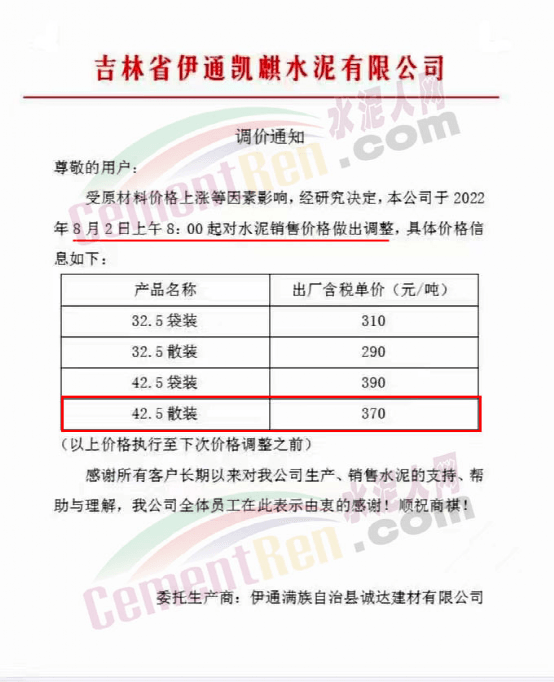 吉林省伊通凱麒水泥有限公司通知,受原材料價格上漲等因素影響,經(jīng)研究決定,公司于8月2日上午8時起對水泥銷售價格做出調(diào)整,調(diào)整后42.5散裝水泥出廠含稅報價370元/噸。