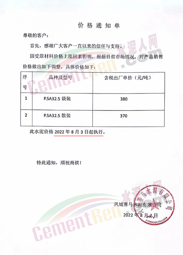 遼寧丹東鳳城賽馬水泥通知,因受原材料價格上漲因素影響,根據(jù)目前市場情況,自8月3日起對產(chǎn)品銷售價格作出調(diào)整,調(diào)整后P.S.A32.5散裝水泥報價370元/噸。