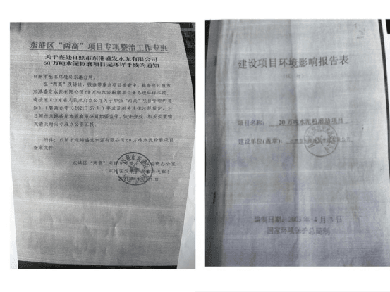 據2003年相關部門環評文件顯示,盛發水泥的磨機為 Φ2.4m×13m超細磨,現場檢查卻發現,盛發水泥的磨機為 Φ3.2m×13m 超細磨。據核查,未發現產能變更后的環評手續!而且企業所在地日照市東港區“兩高”項目專項整治工作專班辦公室于2021年8月31號明確給日照市生態環境局東港分局下發過該企業未辦理環評手續通知,重點提及: