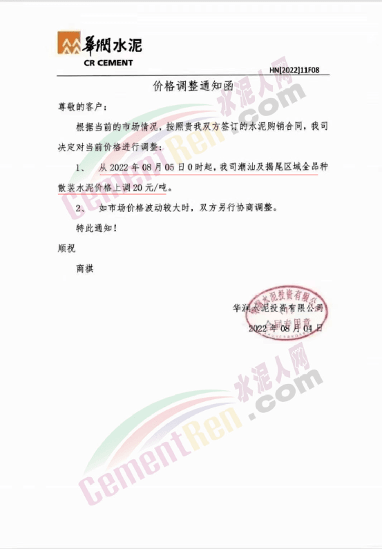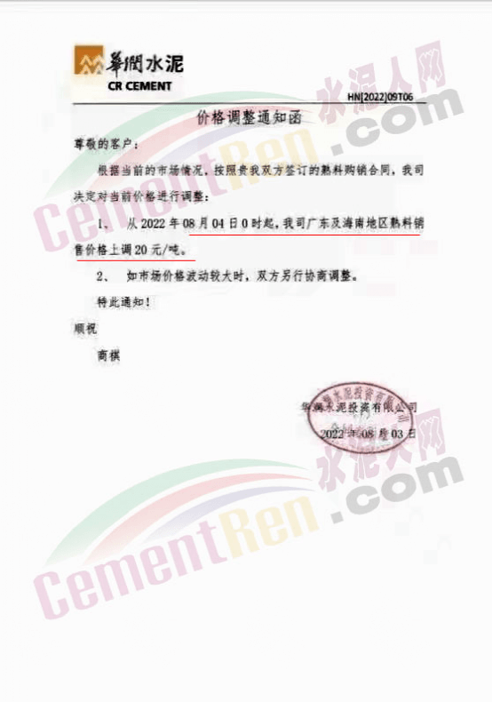水泥人網通訊員消息,日前,華潤水泥投資有限公司通知,從8月4日0時起,公司廣東及海南地區熟料銷售價格上調20元/噸。潮汕及揭尾區域全品種散裝水泥,珠三角(含惠州)及粵西各區域P.C42.5散裝水泥價格同步上調20元/噸。