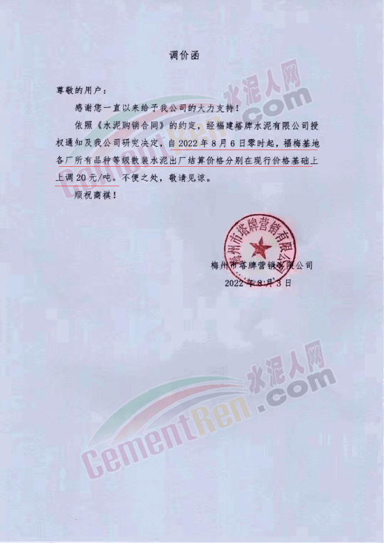 同期梅州市塔牌營有限公司通知,自8月6日零時起,福梅基地各廠所有品種等級散裝水泥出廠結算價格分別在現行價格基礎上上調20元/噸。