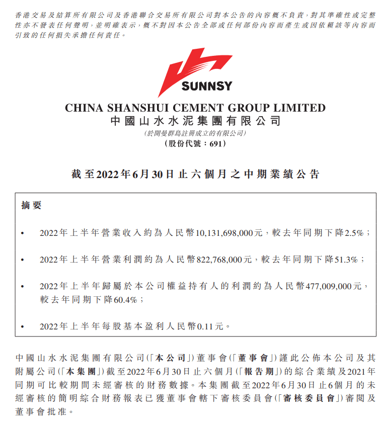 山水水泥(00691)發(fā)布2022年中期業(yè)績,營業(yè)收入約為人民幣101.32億元(單位下同),較去年同期下降2.5%;歸屬于公司權(quán)益持有人的利潤約為4.77億元,較去年同期下降60.4%;每股基本盈利0.11元。
