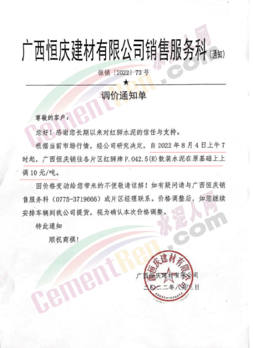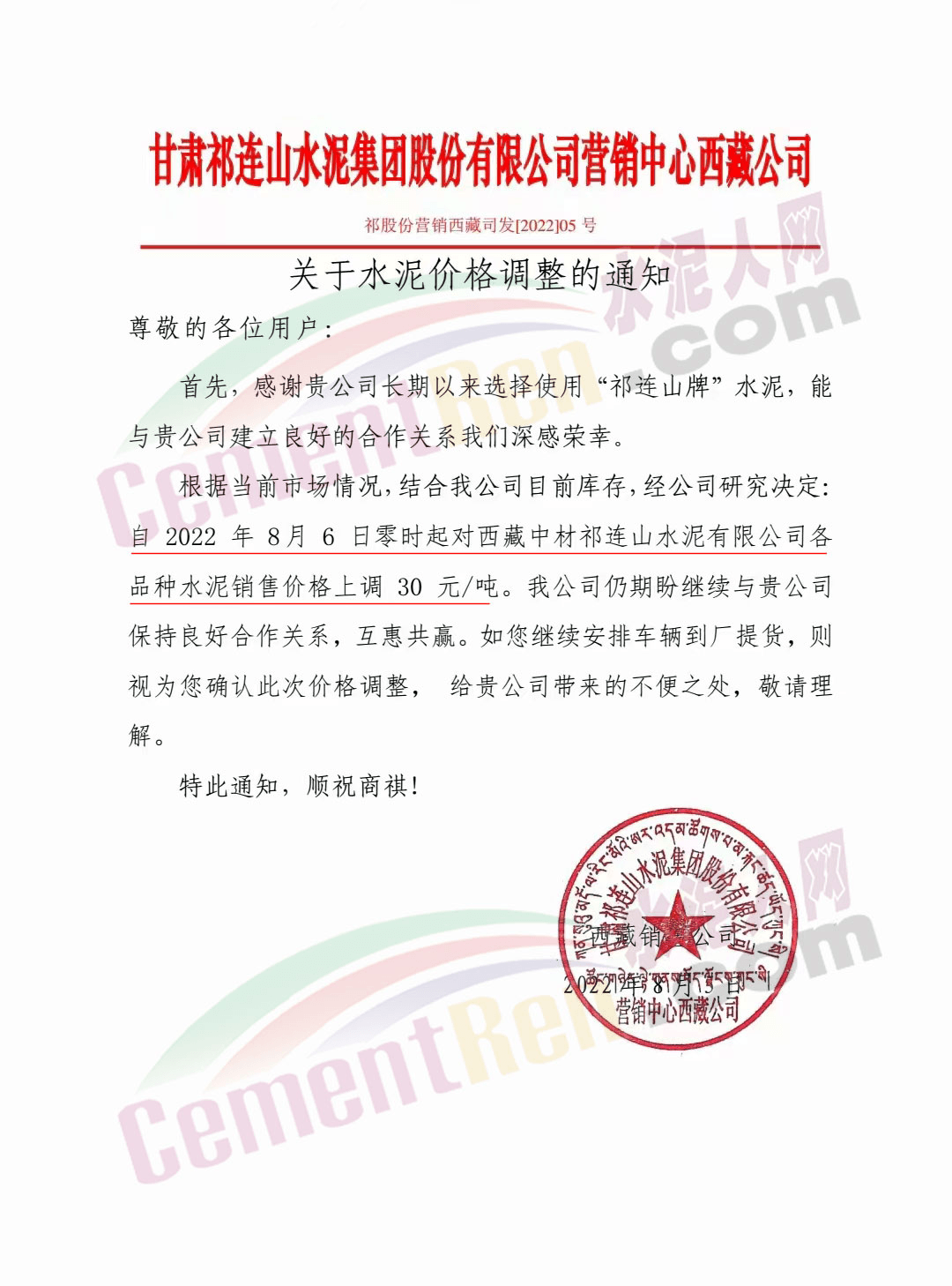 水泥人網(wǎng)通訊員消息,日前甘肅祁連山水泥集團(tuán)股份有限公司營(yíng)銷中心西藏公司通知,根據(jù)當(dāng)前市場(chǎng)情況,結(jié)合公司目前庫存,經(jīng)公司研究決定自8月6日零時(shí)起對(duì)西藏中材祁連山水泥有限公司各品種水泥銷售價(jià)格上 調(diào)30元/噸。調(diào)價(jià)后如繼續(xù)安排車輛到廠提貨,則視為確認(rèn)本次調(diào)價(jià)。