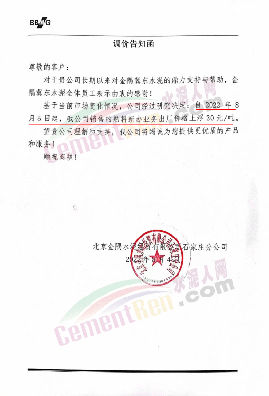 隨著唐山區(qū)域熟料價(jià)格調(diào)漲,北京金隅水泥商貿(mào)公司通知水泥價(jià)格同步上調(diào)30元/噸。