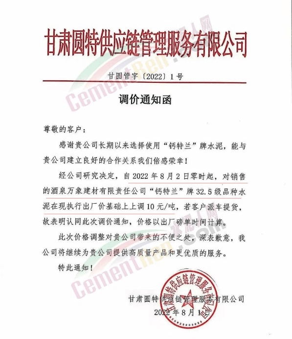 據(jù)了解甘肅、內(nèi)蒙、寧夏多區(qū)域民建市場(chǎng)需求較旺。因前期售價(jià)相對(duì)較低,甘肅圓特供應(yīng)鏈管理服務(wù)公司通知,自8月2日起對(duì)32.5級(jí)品種水泥價(jià)格上調(diào)10元/噸,客戶若派車提貨視為認(rèn)同本次漲價(jià)。