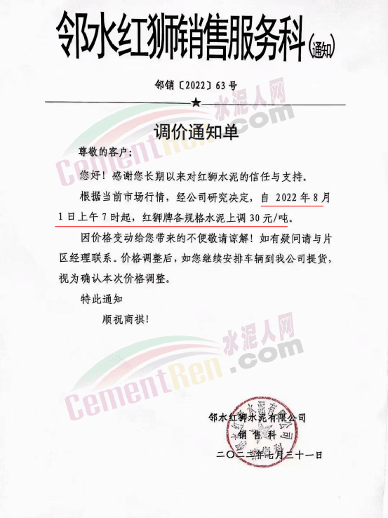 受周邊區(qū)域水泥漲價(jià)影響,鄰水紅獅通知自8月1日起同步上調(diào)水泥價(jià)格30元/噸。
