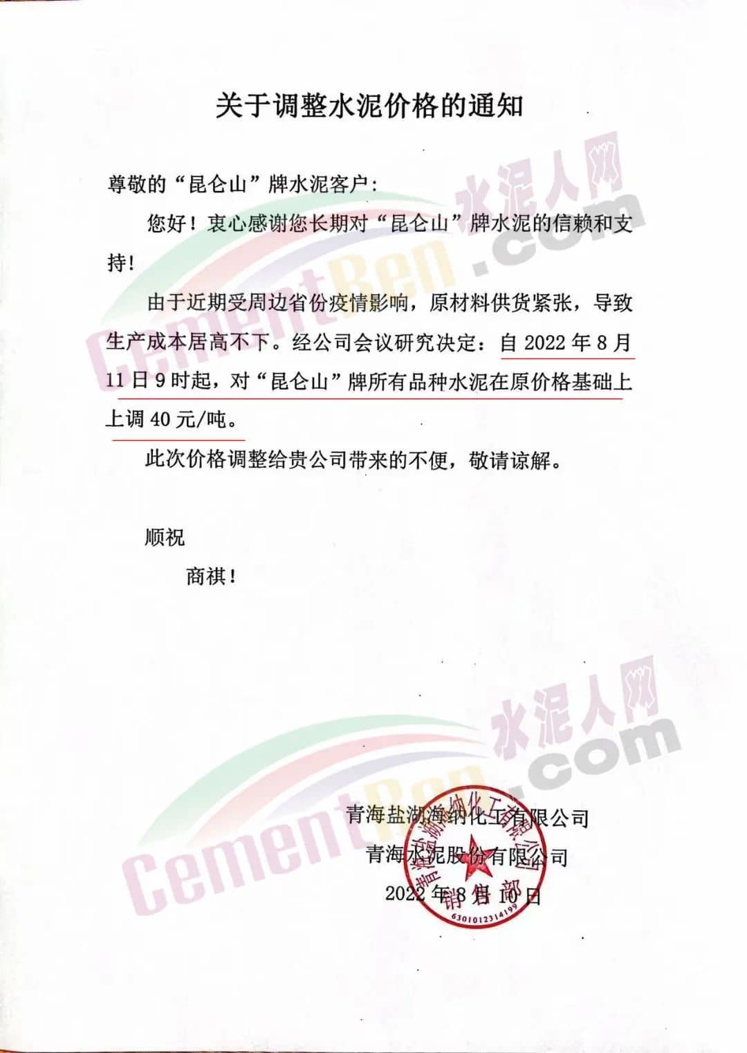 水泥人網通訊員消息,繼前期二十多個地區水泥價格調后,近幾日又有企業跟隨通知上調水泥價格。青海鹽湖海納化工有限公司青海水泥股份有限公司銷售部通知,由于近期受周邊省份疫情影響,原材料供貨緊張,導致生產成本居高不下,經公司會議決定自8月11日9時起,對“昆侖山”牌所有品種水泥在原價基礎上上調40元/噸。