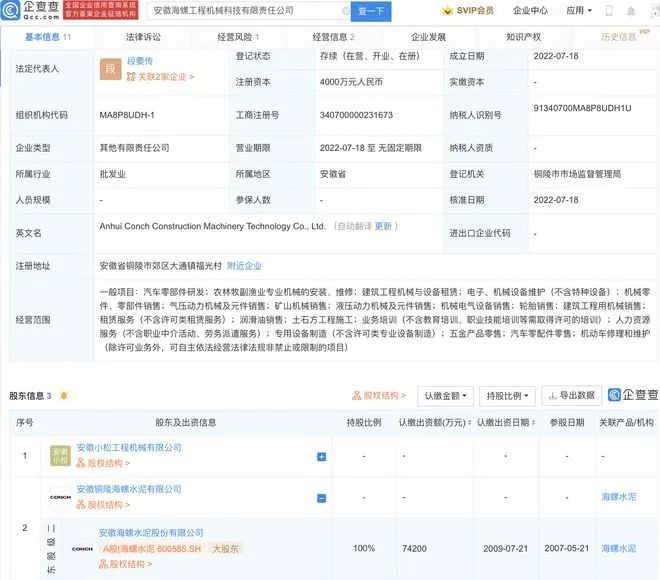 據查詢,集團集團旗下近日還新增了一家名為安徽海螺工程機械科技有限責任公司的企業,法定代表人為段要傳,成立日期為2022年7月18日,注冊資本4000萬元人民幣,經營范圍包含:汽車零部件研發;農林牧副漁業專業機械的安裝、維修;氣壓動力機械及元件銷售;礦山機械銷售等。企查查股權穿透顯示,該公司由海螺水泥全資子公司安徽銅陵海螺水泥有限公司等共同持股。