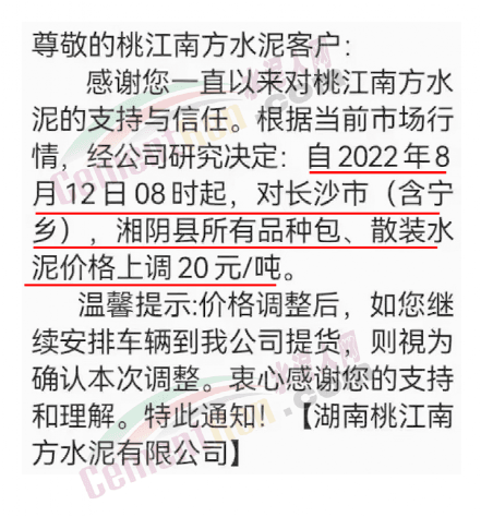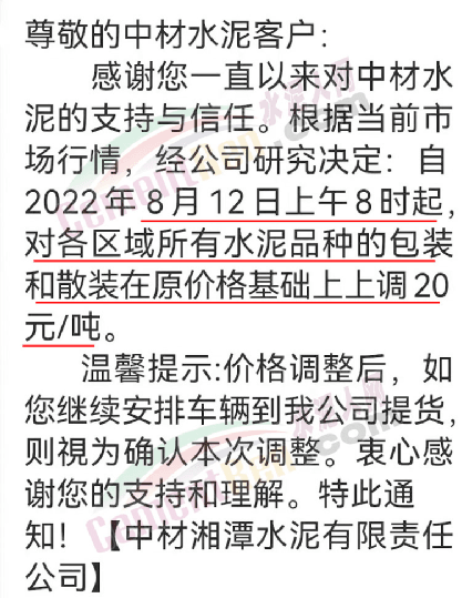 中材湘潭水泥有限責任公司通知,根據當前市場行情,經公司研究決定自2022年8月12日上午8時起,對各區域所有水泥品種的包裝和散裝在原價格基礎上上調20元/噸。價格調整后,如繼續安排車輛到公司提貨,則視為確認本次調整。