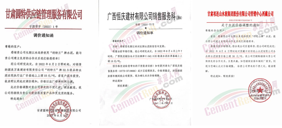 水泥人網監控數據顯示,進入8月份以來,發漲價函上調水泥價格的企業已經有近百家,涉及區域包括廣東、廣西、福建、湖南、四川、重慶、貴州、甘肅、陜西、遼寧、吉林、北京、天津、河北、山東、陜西、西藏等二十多個省市自治區。