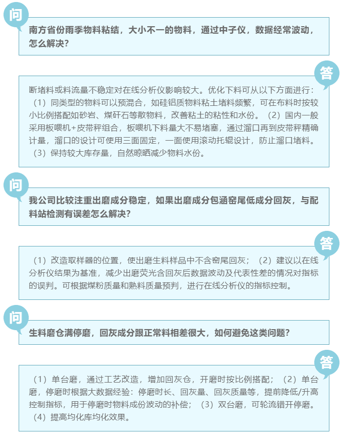 直播中用戶對技術的咨詢提問等互動頻繁,以下集中整理了本次直播中大家在水泥生料生產控制儀器中的所面臨的各類問題,由直播嘉賓蔣山為大家進行疑難解答。