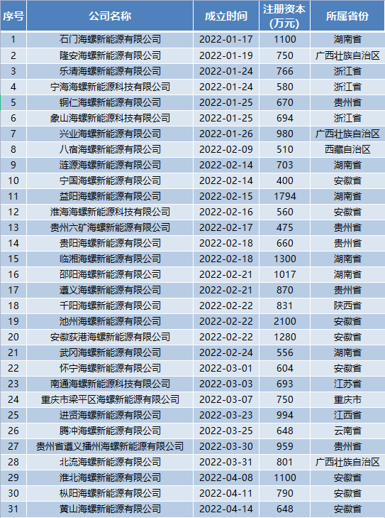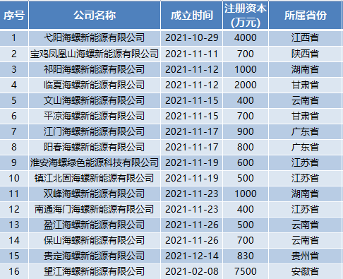 2018年-2021年,海螺新能源獨立出資設立了44家新能源公司。海螺新能源主營業務包括光伏發電、風力發電、儲能系統領域內的技術開發、技術服務,電力項目的建設、運營和管理等。