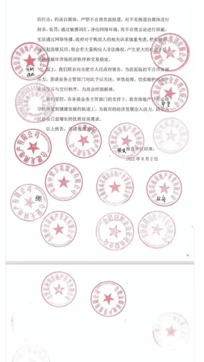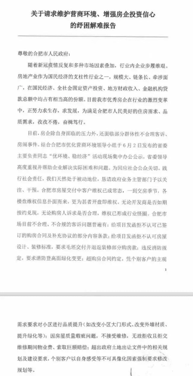 近日,一份寫給合肥市政府的、名為《關于請求維護營商環境、增強房企投資信心的紓困解難報告》的文件流出,落款處蓋著保利、華潤、綠城、龍湖、融創、旭輝和葛洲壩等17家品牌房企的印章。報告請求合肥政府:堅決遏制專業房鬧及種種“惡意維權”行為。
