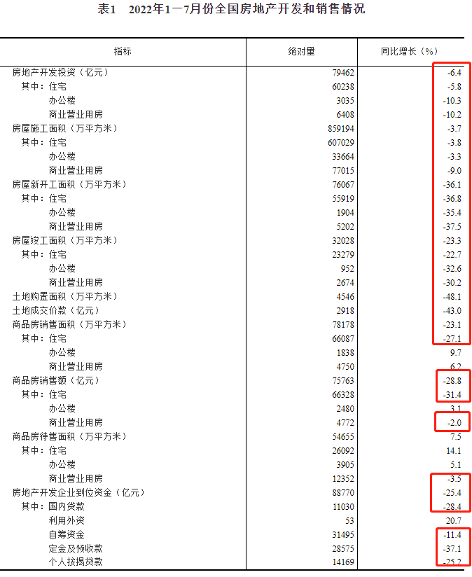 2022年下半年已開啟,全國樓市仍處于艱難尋底中,且下行態勢嚴峻。近日國家統計局發布7月份房地產相關數據,所有指標全部下跌。