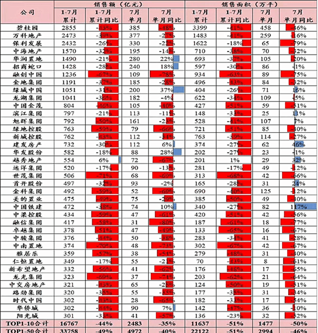 1—7月份,商品房銷售面積78178萬平方米,同比下降23.1%;商品房銷售額75763億元,下降28.8%,7月末,商品房待售面積54655萬平方米,同比增長7.5%。