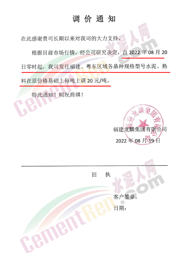 福建多家企業通知,8月20日起上調水泥價格20元/噸,通知一出,多家企業門頭又開始排隊了。